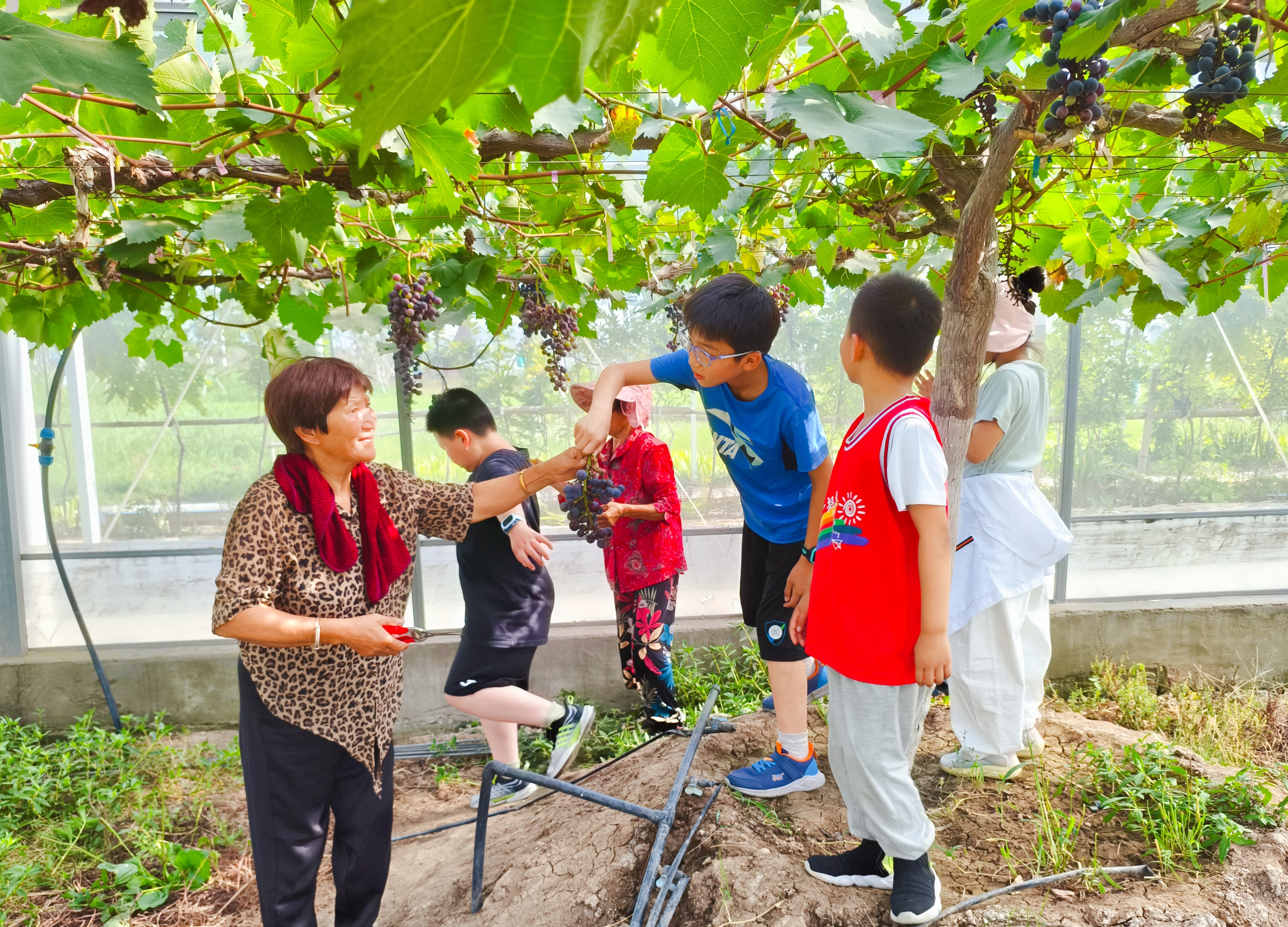 隨后大家分組行動(dòng),在果農(nóng)的帶領(lǐng)下,帶上剪刀和果籃,穿梭于葡萄藤間。小心翼翼地剪下、輕輕地放在籃中,孩子們唯恐損壞果農(nóng)們的辛勞成果。天氣炎熱,衣服被汗?jié)?,但孩子們臉上的笑容比太?yáng)還耀眼?!斑@是我第一次摘葡萄,感覺(jué)很有趣?!苯衲?0歲的劉嘉仁興奮地說(shuō)道。