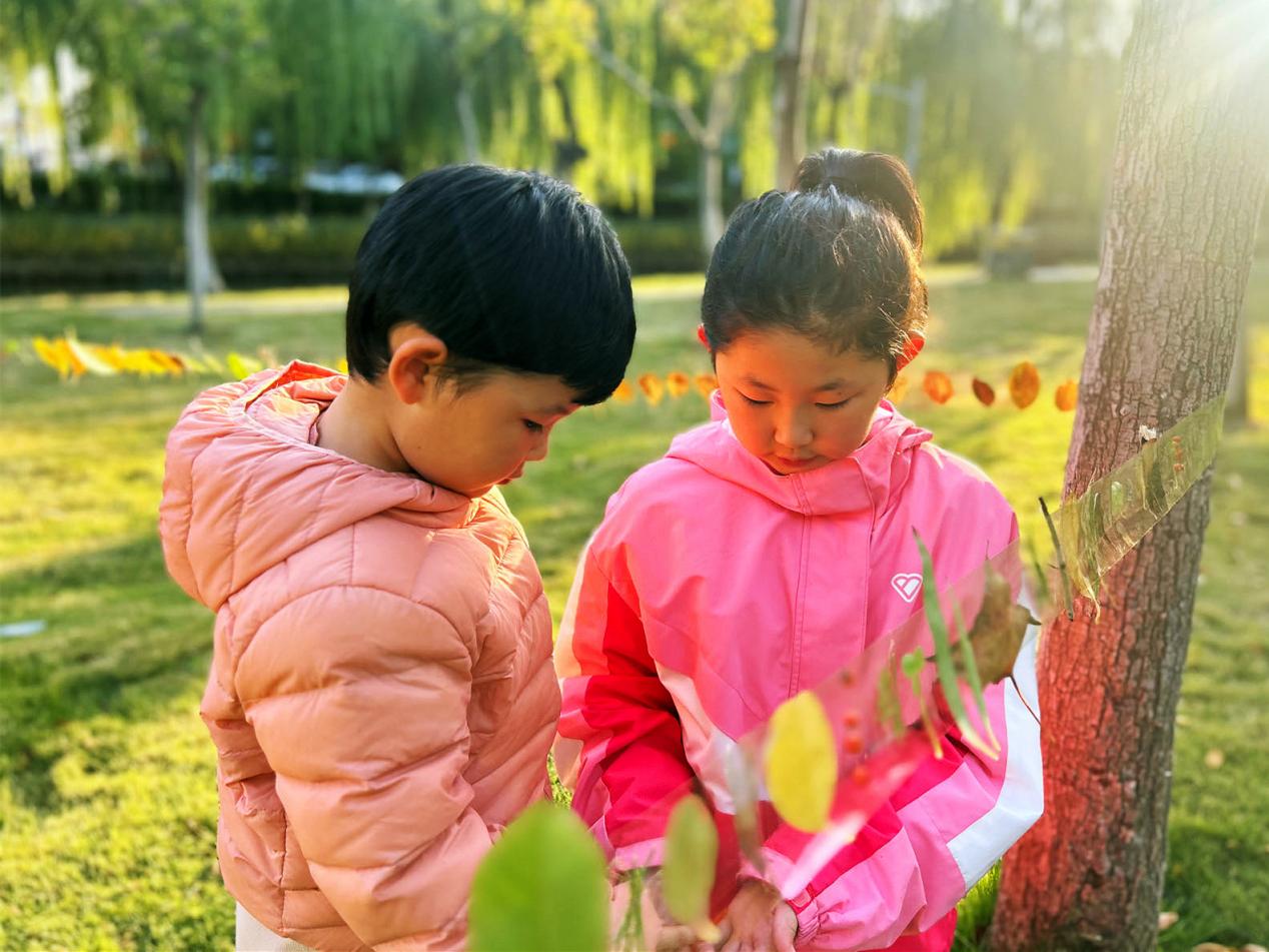 活動中,藝北社區(qū)、巨龍社區(qū)聯(lián)合轄區(qū)幼兒園,帶領孩子們走進蒼梧綠園,感受季節(jié)變化。孩子們手持小筐,仔細尋找季節(jié)變換的蹤跡——金黃的銀杏葉、火紅的楓葉以及形態(tài)各異的落葉都成了他們眼中的“寶貝”。在社工的引導下,孩子們認真觀察葉片的形狀、脈絡與色彩,感受大自然的神奇魅力。