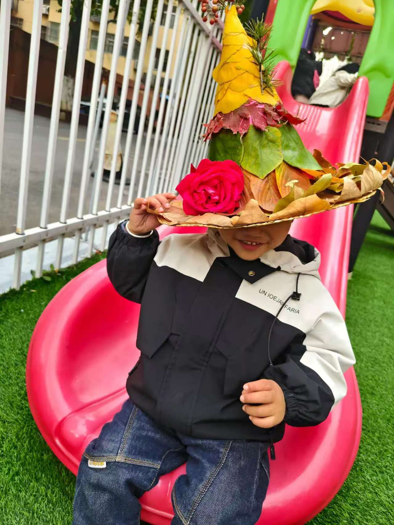 探索結(jié)束后,活動進入創(chuàng)意手工環(huán)節(jié)。孩子們充分發(fā)揮想象力,將收集來的落葉與花瓣巧妙利用:有的變成精致的落葉帽,有的制作成獨具匠心的粘貼畫,還有的用彩紙包裹成精美的落葉花束。“看,這是我做的楓葉皇冠!”一位小朋友興奮地展示著自己的作品。